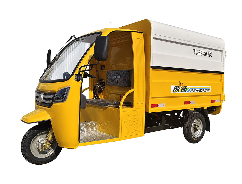 电动三轮自动装卸车,采用液压提升机构和液压自卸系统,是环卫、保洁、物业等部门运输垃圾的车型。